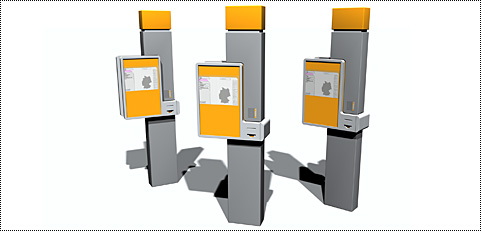 Fahrkartenverkauf Indem der Bildschirm um 90 Grad in eine hochformatige Position gedreht wird, vergrößert sich die nutzbare Bildschirmoberfläche. Welcher Ausschnitt des Touchscreens verwendet wird, wird durch den Punkt bestimmt, auf den anfänglich gedrückt wird. Die Höhe der Benutzeroberfläche variiert demnach je nach Körpergröße. Design: Jochen Bender, Max Volk |